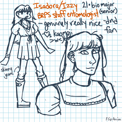 Linkshe was in her last semester as a bio major concentrating in entomology when she noclipped everyone press f for izzys degree. she wanted to get a masters in entomology and get into biodiversity studies but ummm. well i guess she can do the same thing now no degree required! except shes not very confident in her ability to not die so she tends to stay in the lab, especially because she had a VERY brief stint with the meg as an entomologist where she was told she has to study deathmoths n shit. she is not okay with that, she ended up randomly stumbling on the parks service and was like oh god yes please can i just cut open elm bark beetles forever and ever