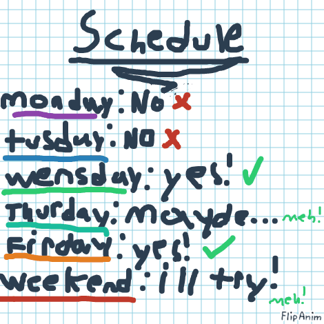 Monday:No Tuesday:No Wednesday:Yes Thursday:Maybe... Friday:ill try... HAVE A GRATE DAY