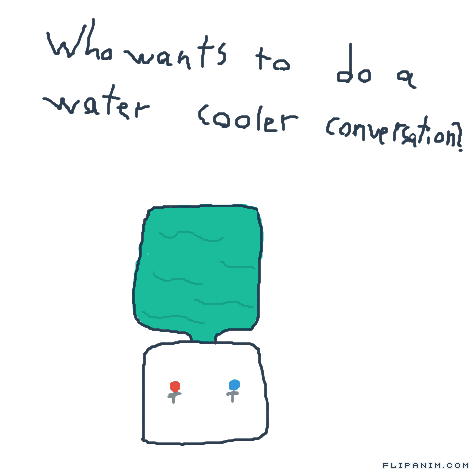 You know, like in those work places and they have the water coolers and the workers will go by it and talk, like this: "Hey fellow worker" "Hi" "So, the boss gave me a raise, you?" "Yeah" "I heard he's going on vacation" "Really?" "Yeah" "I wonder how he can afford it" "Yeah right" *they both laugh*