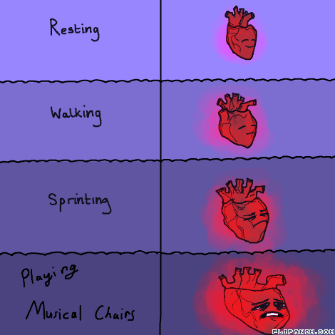 LinkI had a kid in my class when we were playing Musical Chairs said ` THEY SAID THIS WAS GONNA BE FUN, MY HEART IS ABOUT TO STOP! `