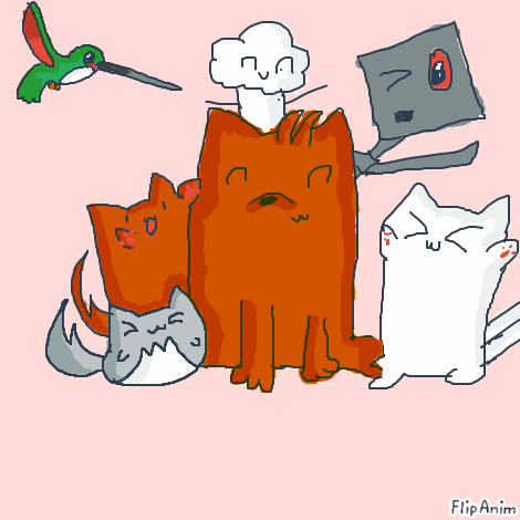 There’s me, Cloud (the grey cat), Bongo Cat, Chestnut-The-Cat, Tropical (the hummingbird), a muffin and Wither Skeleton!