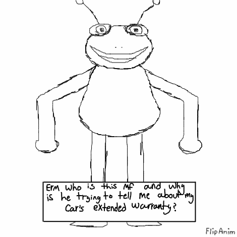LinkYou guys should I be scared of this guy? He keeps appearing in my house specifically in the closet of my bedroom that has no door and keeps trying to tell me about my car's extended warranty.