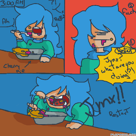 -Jynx runs with a pie in her handsand behind of her Restart (Rebooting's oc)-