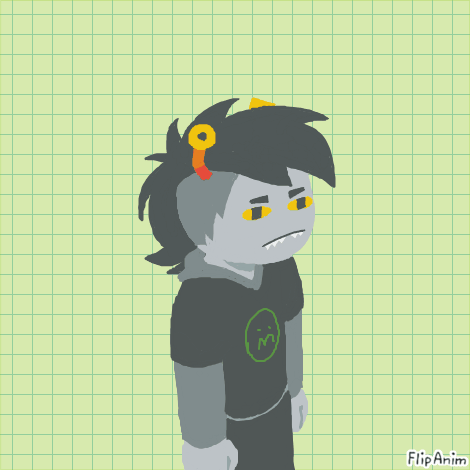 Linkmissing tooth. 2 curved horns, one ends in a circle, the other a pointed arrow. wears green accent color items to imply olive blood color